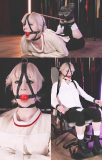 2. 科拉仍然穿着束缚衣,被五花大绑——她的脚被绑在头上,根本无法挣脱这种不舒服的姿势。她嘴里塞着球形口塞,口水顺着下巴滴落,她呻吟着求饶(她已经失去了逃脱的希望)。