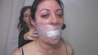 镇上来了个新的猫女窃贼!玛古特来了,她正在寻找猎物。不幸的是,黛安似乎成了她的目标!玛古特跟踪她到了家。一进门,她就抓住黛安的胳膊,用绳子把她的双手绑了起来。“什么……”玛古特用手捂住她的嘴。她脱下黛安的袜子,用袜子和一块大的透明胶带封住她的嘴。然后,她一边嘲笑黛安,一边用很多绳子把她捆起来。黛安被捆得结结实实之后,玛古特羞辱了她一番,然后扬长而去偷赃物。黛安被留在那里,被绑着,嘴也被堵住了,完全无助!There’s a new catsuit burglar in town! Margout has arrived and she’s looking for victims. Unfortunately for Dyanne, it seems she’s the chosen one! Margout follows her to her house. Once inside, she grabs her arms and ties her hands with rope. “What the… . Margout handgags her. She removes her socks and gags Dyanne with her socks and a big transparent tapegag. Then she ties her up with a lot of rope while she mocks her. Once she’s hogtied tight, Margout humiliates her a little before leaving for the loot. Dyanne is left there, tied up and gagged, totally helpless!