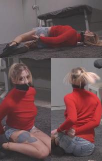 艾梅柏穿着红色毛衣、短裤和运动鞋。她嘴里塞满了东西,被绑上手铐,然后又被五花大绑,任其在地上翻滚。Amber is in her red sweater and short and sneakers. Stuff and wrap gagged, she gets cuffed and then hogcuffed and left to roll around.