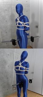 小姐姐身穿蓝色zentai,骑在两端绑着振动器的横杆上,进行站立强高play,爽的各种原地抽搐嗷嗷叫。