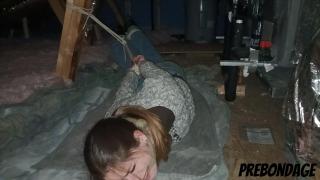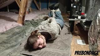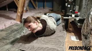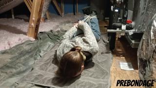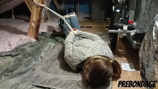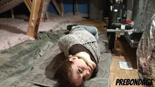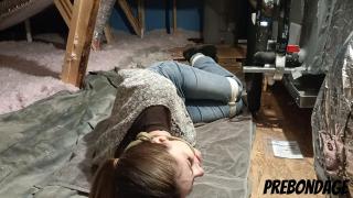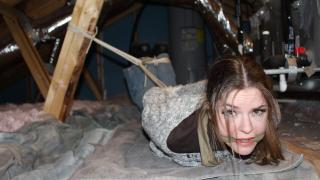 Kat wakes up in a strange yet familiar place. It takes her a moment...then she realizes that she is tied up in her own attic! Kat Snow Angry Ballgag Bondage Drooling Hogtied Scared Struggling