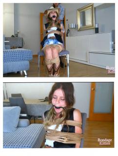 Aly had everything ready for the cowboy themed festival fashionable clothes, new cowboy boots, and her partner Lex's stolen cowboy hat. She thought she could take him without permission, but Lex had other plans. Just as Aly finished dressing, Lex walked in and caught her red-handed. Knowing she wouldn't listen to excuses, he quickly restrained her, tying her hands behind her back with a neat rope. To keep her quiet and obedient, he placed a ballgag tightly between her lips, muffling any protests.