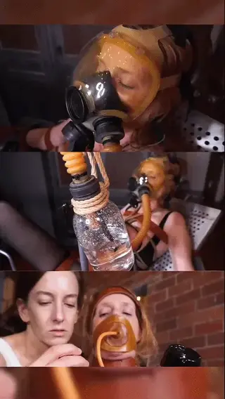 During the first part of this scene Elise uses a rubber pump gag on her patient, and later swaps the pump gag for a unique amber rubber gas-mask which is attached to a small bubbler bottle. As you will see, Elise has a never-ending supply of cool gear.
