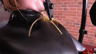 Elise first straps MedicalSlave into an ultra-heavy rubber straitjacket. MedicalSlave says this straitjacket reminds her of the heavy protective blanket that dentists drape over their patients when taking X-rays. No wonder she likes being restrained in it. Next, Elise inserts a two-pole e-stim plug into MedicalSlave's pussy then directs her to sit in the chair where she uses leather straps to prevent her from escaping.