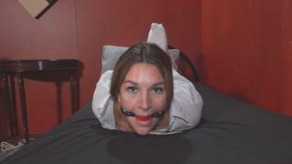 阿兰娜兴致勃勃。她手脚已经被红绳捆绑,但她还嫌不够。她穿着白衬衫和堆堆袜,除此之外几乎什么都没穿,我们给她塞上球形口塞,然后把她五花大绑地绑在床上,让她挣扎。Alana is in a playful mood. Already tied hand and foot with red ropes, she needs more. Wearing a white shirt and slouch socks and not much more, we add a ballgag and then hogtie her on the bed and leave her to struggle.