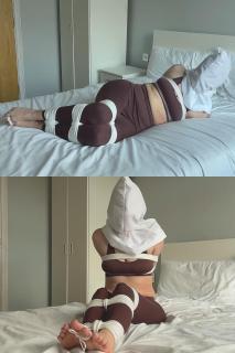 我的每一个动作都异常艰难。双臂在背后绷紧,双腿被牢牢地锁住,无论我如何扭动或挣扎,绳索都纹丝不动。我的脚底在挣扎。头罩加剧了感官剥夺,让我感到赤裸裸的暴露和束缚。我拼命挣扎,被彻底捆绑,困在这紧紧的绳索之中。I’m tied up in white rope bondage, my legs together and my arms pulled tightly behind my back. A white hood covers my head, ballgagged underneath, leaving me blind and helpless. Bound in rope, I’m a submissive slut, barefoot, my feet are on display for a foot fetish tease.
