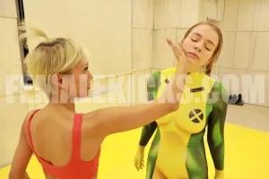 By the end, both the punchdrunk superheroines are hovering and dazed (please show dazed facial expressions) and Rose is ready to finish them off. First, she takes Jessica and positions her standing with her legs spread. Rose then kneels down and gives her a flurry of speedbag punches to the crotch – making Jessica’s eyes cross and ass bounce until she passes out (camera angle of Jessica’s ass bouncing and eyes crossing as her crotch is rapidly punched over and over again). Then Rose takes Stacy and positions her standing with her legs spread. Rose then holds Stacy’s wrists and gives her continuous kicks to the crotch – making Stacy’s eyes cross and ass bounce until she passes out (please include camera angle of Stacy’s ass and eye crossing as she gets kicked). With both ladies out, Rose escapes.