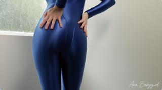 Shower in Blue Spandex Catsuit
