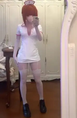 素体娃娃身着肉色全包乳胶衣并头套电锯人的玛奇玛头壳,外搭开胸护士装和吊带丝袜和黑色小皮鞋,对着镜头自萌中...