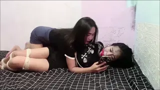 My girlfriend drugged me because she think, i'm with her boyfriend. Hogtied on a bed she tickle me really hard. But her boyfriend tie us feet to head and let us struggle to escape from the ropes. Ballgag, hogtied, cute indonesian, struggling, moaning, bound bare feet, neckrope, revenge,