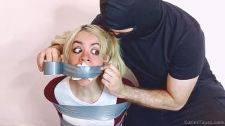 Without wasting time, he starts wrapping her up in silver duct tape. First he crosses her wrists behind her back and tapes them really tight. Nani, with her adorable little voice, says “I’m just a curious girl”. He continues wrapping tape around her torso, perfectly accentuating her curves. Then he sits her on the floor and begins taping her legs, starting from her new boots and working all the way up her thighs until they are completely fused together. Nani looks at him smiling and tries to negotiate between giggles: “I’m leaving… I won’t come back, I promise!”. The masked man just replies “I don’t believe you” and keeps taping her.