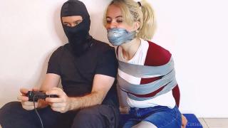 Now the masked man is sitting calmly playing video games while Nani, taped up beside him, insists with muffled moans until she manages to get him to hand her the controller. Even with her hands taped behind her back, she plays for a while and does exactly what she wanted!