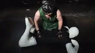 The casting was performed in our booth by Elise Graves and Mistress Alice. It didn't take them very long to cast Strange Hobbies' arms and legs in a bent position, including a small piece of foam over his elbows and knees to soften his crawl on the concrete floor. Casting his head went fairly quick as well, leaving only his nose protruding for air. When they finished, Strange Hobbies was completely helpless, blind, and totally dependent on Elise and Alice.