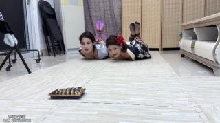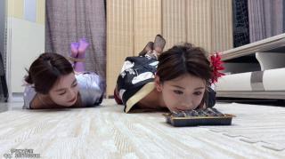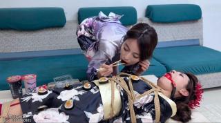 两人上演人体寿司 由本工作室对于两位模特进行嘉奖的小剧情 桌上摆了三盒寿司和两杯奶茶 但是在吃喝之前进行一个小游戏 抽扑克牌 比大小 结果是苏苏赢的胜利 于是将灵儿紧密捆绑成粽子放在桌上 开始了她的玩弄 挠脚 抚摸身体 甚至还将热乎乎的寿司放在灵儿的胸上肚子和大腿上 苏苏玩弄一会儿后忍不住先吃了 面对这样一位大美女 吃起寿司来更是美味