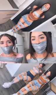 Being placed on the bed, her stepbrother begins to tie her with tape well adhered to her skin while she moans MMMMPPPHH and Addy begins to laugh asking her if the tape is tight enough. Carlita moves while being tied on her legs, arms, wrists and breasts. When Addy releases her lips, Carlita begins to speak and a pair of socks are placed inside her mouth until her cheeks are full and her huge clear eyes are wide open in surprise.