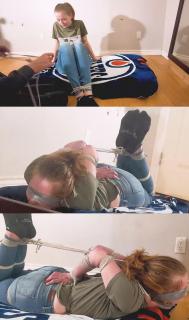 She gets a sock taped in her mouth, a tape blindfold before her hair is tied to her elbows.