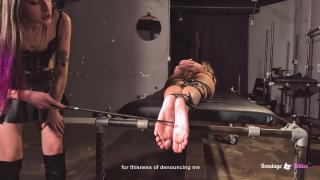 然而,玛吉亚决定将她囚禁数日,把她绑在桌子上。Magia dominates Kali in a dungeon punishment bondage scene, restraining her with handcuffs and suspension, delivering intense spanking with floggers and canes, and finishing with a strong bastinado punishment before keeping her captive.