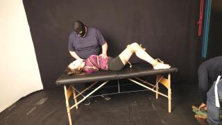 The next scene takes place in another location that resembles a photographic studio—but reveals itself to be something far more sinister: a place where captured agents are interrogated for information. Vika is now barefoot. This time, the men tie her with rope (on-screen tying), methodically securing her hands behind her back, with additional ropes wrapped around her arms, chest, and legs.