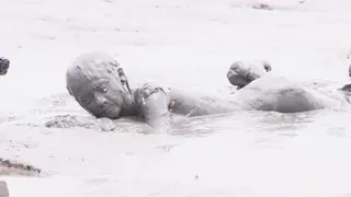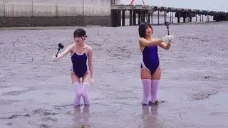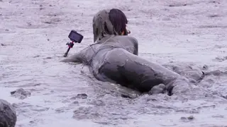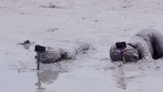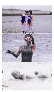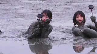 两个妹子身穿死库水在滩涂玩泥巴,运动相机自拍,最后双双埋进泥坑
