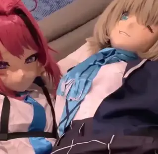 两只娃娃身着肉色全包紧身衣并头套全包裹头壳,外搭女高JK水手服和白色棉袜,在酒店的床上缠绵在一起...一只人偶抓住另一只玩偶的脖子玩呼控play,另一只手疯狂拨弄下面的棒棒...最后两个人偶互相手交handjob,跪姿贴贴把貂蝉在一起...