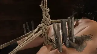 The final scene starts with Brooklyn atop a wooden box in a hogtie, wrists tied to legs. There is an up line that will slowly be pulled tighter, and tighter, until Brooklyn takes flight in a merciless suspension. First Brooklyn endured grueling torment and earned the right to be lifted into the air for one final orgasm.