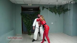 All the fight scenes one sided with Lora dominating her larger opponents. She is ruthless and merciless. Lora’s character also has superhuman ninja like strength and periodically, using either one or both arms grab your male opponents by the throat or karate uniform top etc and forcefully lift, drag or push them into walls or hold their karate top with one hand while she repeatedly punches them in the face. Lora also uses her super strength to grab and drags her male opponents by their hair further humiliating them.