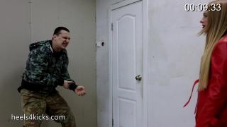 As the man looks down at her boots Gloria launches the outside side of her hand in a straight karate chop to the man’s throat. As he struggles to breath holding his neck Gloria speaks again, “Because you like my boots… have closer look.”