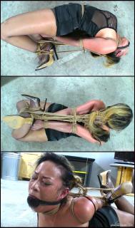 At the start of the live show, Martin stands me up and ropes my neck to the ceiling while he binds my elbows, ties a crotch rope on me and gags my mouth. I was pleasantly surprised when he brought me to the ground and laid me on my stomach. A clear indication that I was going to be hogtied. Sure enough, my ankles are tied and my body is cinched together into a tight little package. The challenging part was having to hold my head up until Martin tied my hair into a ponytail and wrenches it back. My favorite part was when he laid me onto my side. You can see how beautifully arched I was and it didn't take long for me to attempt to get back onto my stomach but I wasn't very successful. After some time, Martin flips me back over and that is how I remained until the end of the show.