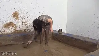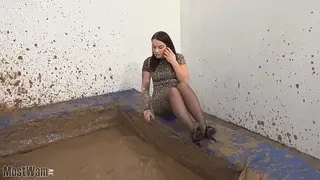 【中文湿身系列】Charlee穿着豹纹连衣裙和黑丝,在泥坑里游玩。Charlee gets covered in mud in our mud pit, wearing a leopard print dress and tights.