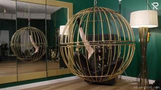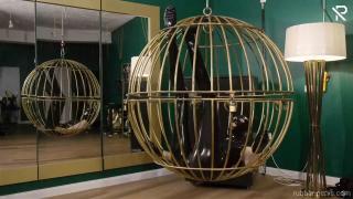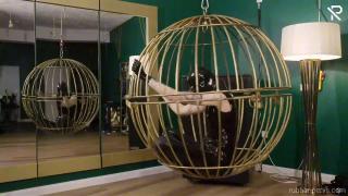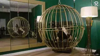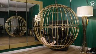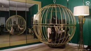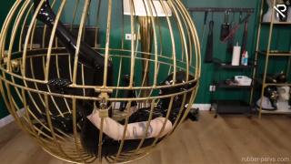 Trapped in a golden bird cage this little latex slut had nothing else to do, than playing with herself. Wrapped in a full black latex catsuit, black rubber socks, long gloves and a latex mask she was nothing more than her desires. Her only company was a huuuge black dildo, and they got very intimate with each other.