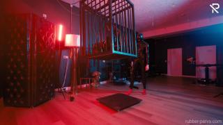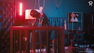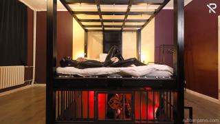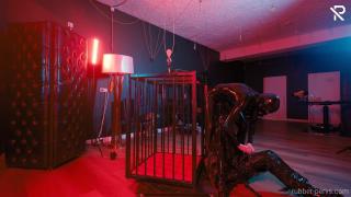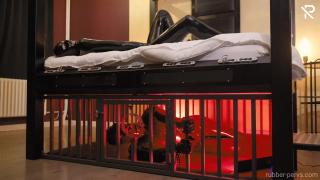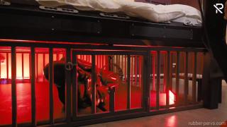 Rubber Nights: The rubber slave rests tight in a cage under the bed