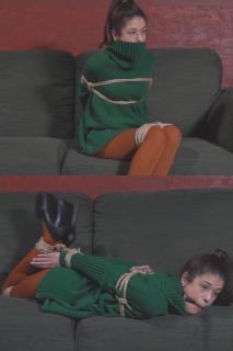 维罗妮卡穿着一件漂亮的绿色毛衣,搭配焦橙色紧身裤和高跟鞋。她被旧绳子捆绑起来,嘴里塞着球形口塞。她很喜欢这些绳子,最后被五花大绑地绑在绿色毛衣上。Veronika is wearing a gorgeous green sweater and burnt orange tights and heels. She gets tied with old ropes and a ballgag is used. She loves the ropes and ends up hogtied on the green sweater.