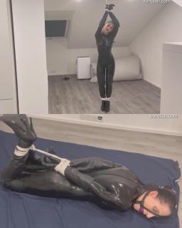 在这里,宝拉向我们展示了一套令人印象深刻的搭配:乳胶紧身衣、一双皮质过膝长靴和长及手肘的皮手套。在她被捆绑并塞住嘴之前,她还有机会再摆一会儿姿势给我们看。Here, Paula shows us an impressive combination of a latex suit, a pair of leather thigh-high boots, and long leather gloves that reach past her elbows. And before she’s hogtied and ballgagged, she gets to pose for us a little while longer.
